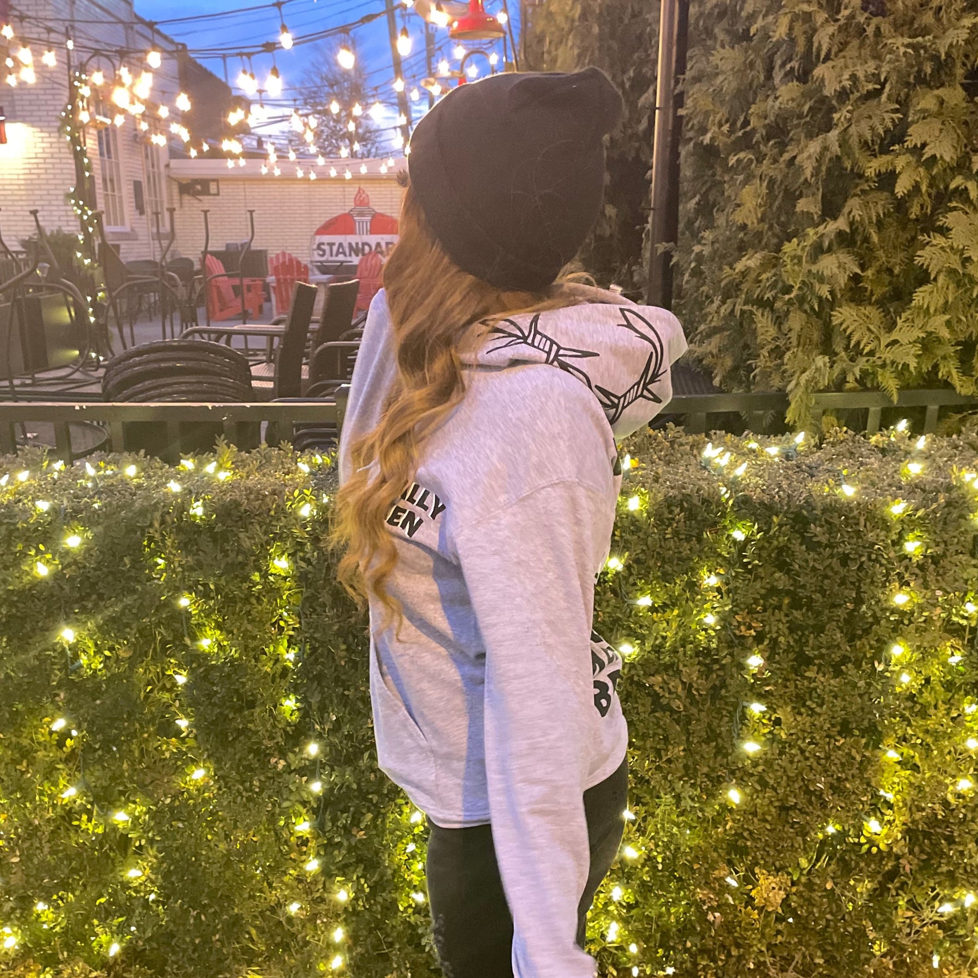 Made from 100% cotton, it features a small front design in the left corner, a full back design, and half barbed hearts on the hood.